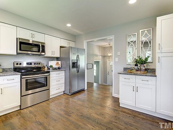 GORGEOUS, move-in-ready, updated home! Brand new kitchen boasts GRANITE countertops, STAINLESS STEEL appliances and beautiful white cabinetry. REAL hardwood floors throughout the main level and bedrooms. The updates continue with new LIGHT FIXTURES, new CARPET, and fresh paint throughout the interior. HUGE family room with wood burning fireplace. Highly desirable Raleigh location central to shopping, restaurants, parks and entertainment. NO HOA! WELCOME HOME!