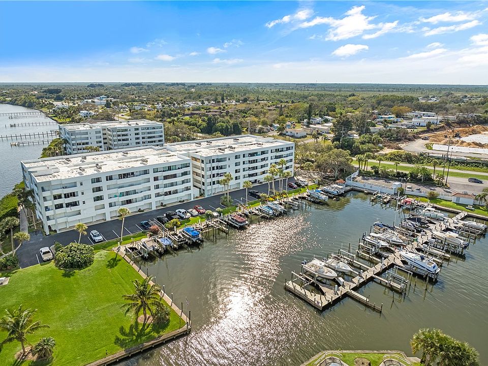 Calling all boaters! Rhum Cove Marina is a boaters paradise. With this condo comes a deeded boat slip & lift. This 3 bedroom 2 bathroom unit is ready for your imagination. Enjoy the views and Space Launches overlooking the Indian River from your 47 foot balcony. Community features a pool, hot tub, fitness center, sauna, BBQ area, clubhouse, tennis court & fishing pier. There is a 1 car garage under the building with large storage room. Pets allowed- 1 dog or 2 cats not to exceed 15 lbs.