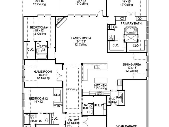 Entry framed by home office with French doors. Game room with double doors and 12-foot ceiling just off the extended entry. Spacious family room with a wood mantel fireplace and wall of windows opens to the dining area. Kitchen features an island, two wall ovens, 5-burner gas cooktop and walk-in pantry. Private primary suite with a wall of windows. Primary bath offers dual vanities, garden tub, separate glass enclosed shower and two walk-in closets. Secondary bedrooms offer walk-in closets. A Hollywood bathroom and utility room complete this spacious design. Extended covered backyard patio. Mud room just off the four-car garage.
