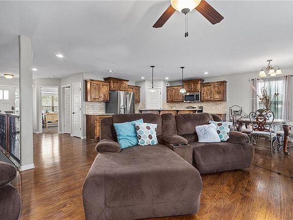 As you enter the home, you will be greeted by beautiful wood floors that extend throughout the very open main floor. The kitchen boasts granite countertops, stainless steel appliances, and a huge walk-in pantry. Additionally, there is an island/breakfast bar, perfect for casual meals or entertaining guests.