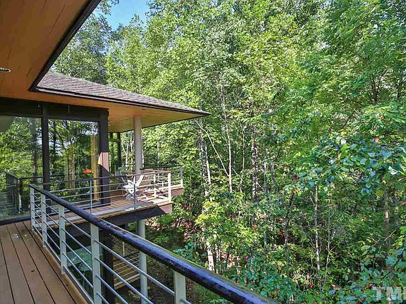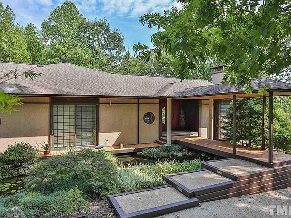 GREAT PRICE! Gated, golf course community, Governors Club. Exceptional Modern home. Private lot w/serene nature views (3/4 acre). Floor to ceiling windows. Gracious entry to harmonious living space. Delight in treetop views on Main Level MBR (PLUS, 2nd BR on Main-currently used as Office). Stunning Anigre wood Kitchen cabinets. DR-SOLID Mahogany walls. Pennsylvania Blue Stone floors.Open architecture. Solarium. Soothing Koi pond. Generator.Club Membership Available. Close to UNC, RTP, RDU and Duke.