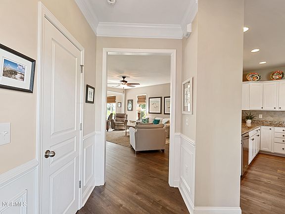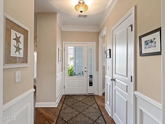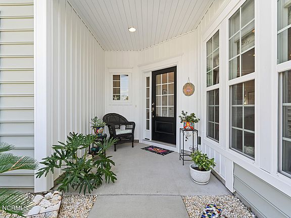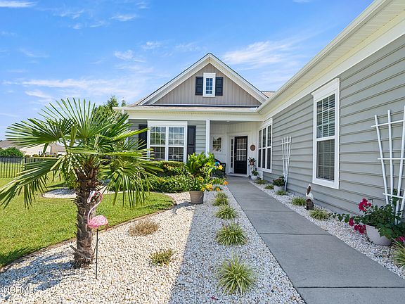 This well-built, single-story custom-built home in Rivermist at Dutchman Creek enjoys expansive lake views and the soothing sounds of a fountain. Rivermist's central location puts downtown Southport and the sandy beaches of Oak Island just minutes away. The home has a coastal Craftsman cottage vibe, is nestled on a tranquil cul-de-sac, offers a perfect blend of elegance and comfort. The spacious open floor plan offers 3 bedrooms, 2 bathrooms, a sunroom, and 2,189 square feet of thoughtfully designed space. Relax in the premium 6 person jacuzzi spa with covered shade cloth pergola overlooking the lake. Tropical landscaping invites you to the charming front porch, leading to an elegant foyer adorned with custom wainscoting and crown molding. Inside you are immediately drawn to the serene water views. The luxury vinyl plank flooring flows seamlessly through a living area that exudes both warmth and natural light. The spacious kitchen is a culinary delight, boasting granite counters, abundant pristine white cabinetry, and stainless-steel appliances. The central island serves as an ideal prep area and additional bar seating, perfect for casual meals, while the dining area accommodates more formal dining. The pass-through counter overlooking the great room offers extra bar seating, enhancing the kitchen's functionality and flow. The expansive living room, with an alcove designed for your entertainment center or display shelves, flows effortlessly through glass French doors into a versatile flex space ideal for a home office or den. Adjacent to this is a sunroom adorned with a beadboard ceiling and travertine tile floor, both rooms offering stunning views of the serene lake and fountain. The sunroom also includes sliding glass doors accessing a pergola-covered back patio surrounded by a lush lawn, creating a seamless indoor-outdoor living experience. The owner's suite is a serene retreat featuring plush carpeting, a tray ceiling, and picturesque lake views.