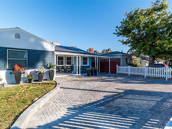 Absolutely charming 1940s home featuring a perfect blend of vintage and modern details throughout. Great curb appeal with a white picket-fence, electric sliding gate, brick patio for entertaining or 4-car parking, raised lawn, and covered front patio. Enter the 3-bedroom, 2-bathroom home into a classic living room showcasing hardwood-flooring and fresh paint throughout, crown and baseboard molding, brick fireplace and tons of natural light. The 1,877 SqFt floorplan carries on into a cozy dining room with bay windows, and louver doors leading into the kitchen. Find a long kitchen with nice porcelain tile flooring, granite countertops, lots of cabinet space, and access to the family room complete with a tall, corner brick fireplace, lots of wall space, and sliding doors to the backyard. Bedrooms are all spacious and bright with crown-molding. The spacious primary bedroom comes with ample closet space, a ceiling fan/light fixture, plus a private, remodeled bathroom that has a double-sink vanity, along with a separate jacuzzi tub and shower. In 2003, an addition was added to both the living room and primary bedroom. Sitting on a 6,250 SqFt lot, the backyard offers a relaxing paved patio, wood chip area, and turf area for all your outdoor activities. Owner converted the permitted storage space into a guest house that has a kitchenette, AC wall unit, bathroom, laundry room, and extra room for an office or possible bedroom. Additional features to the home include OWNED solar panels, and sound proofing in the music room. Close to NoHo Arts District, Magnolia Blvd with multiple restaurants, shops, and cafes, Burbank Blvd with nightlife, North Hollywood metro station, and studios. Easy access to 134-Fwy, 170-Fwy, and the 5-Fwy.