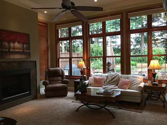 Int Features: 12 ceilings in Living Rm., Kitchen, Dining, MBR, MB, Foyer, and Hallways. The rest of the house has 10 ceilings. The back of the house has walls of insulted windows overlooking the patio that extends across the back of the house and a privacy fence to common area. Beautiful large crown moulding and wide baseboards throughout and columns to formal dining/or office area. Large tilt windows with wood blinds and accordion shades. French solid wood and stained 8 doors to bedrooms and MB and painted pocket door to guest bath. Large walk-in closet in MB with loads of built-in shelves, garden jetted tub in MB and walk-in 2 person shower, long solid surface double vanity that extends around the bathroom. GB has tub and shower combo and vanity with solid surface. The floors are a beautiful smooth, stained, and sealed stamped concrete in foyer, kitchen, dining room, halls, walk-in closet, and bathrooms with carpet in bedrooms, living room and formal dining/office. Sealed and stamped floors under carpet also. Chandeliers in foyer, formal dining/office, GB vanity area, dining room, and MBR. Large ceiling fan in living room and a lighted ceiling fan in GB. Can lights in 90% of house and speakers installed in ceilings in living room, MBR, and under eaves in patio area. Gas fireplace in living room. The kitchen has all stainless steel appliances (dishwasher, gas counter top stove and electric oven, garbage disposal, refrigerator) laundry room, pantry, 3 person bar, microwave, and very tall cabinets. All appliances and washer and dryer stay. MBR has 10 french door leading to patio. There is a new wall mounted tankless gas water heater. Aggregate double drive, front entry, sidewalk, and rear patio. Brick is from the old train station in Nashville. Brick retaining wall around back of patio. Architect shingles.