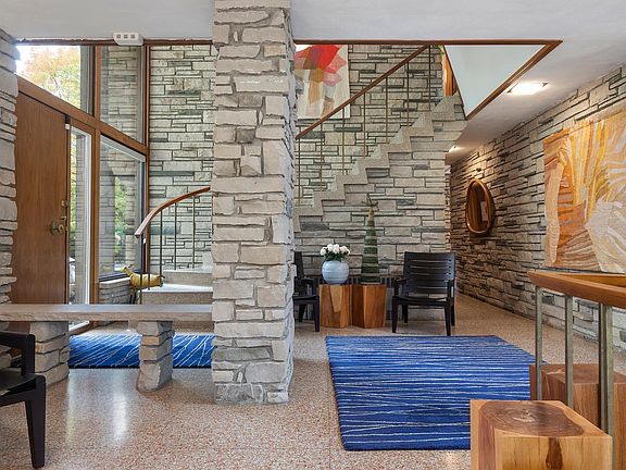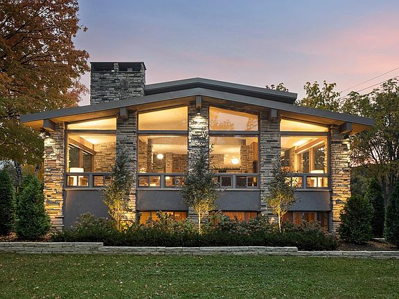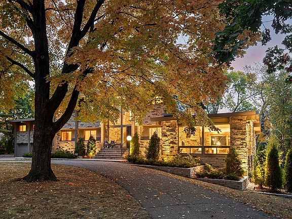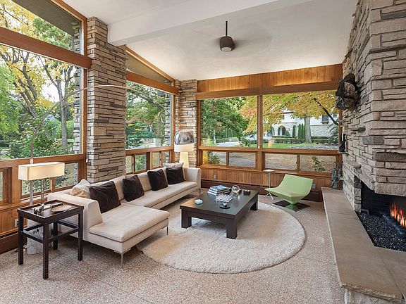 Exceptional architect designed Mid-Century Modern home on almost an acre set pondside incorporates high ceilings, walls of glass, terrazzo floors, and an open floor plan taking great advantage of light and views. The main level features a stunning new kitchen with Italian walnut cabinets, quartzite counters, high end stainless steel appliances, and dining areas, all overlooking the glass walled great room with 14’ ceilings and gas fireplace. The main level includes a gracious foyer with curved staircase, study & ¾ bath, as well as balcony overlooking the pond. The walkout level, which includes a generous family room with fireplace, theater room, and laundry, plus bath and bonus room, walks out to an 800 square foot bluestone patio. On the upper level, there are 5 bedrooms and 3 baths. Triple attached garage. Tremendous opportunity.