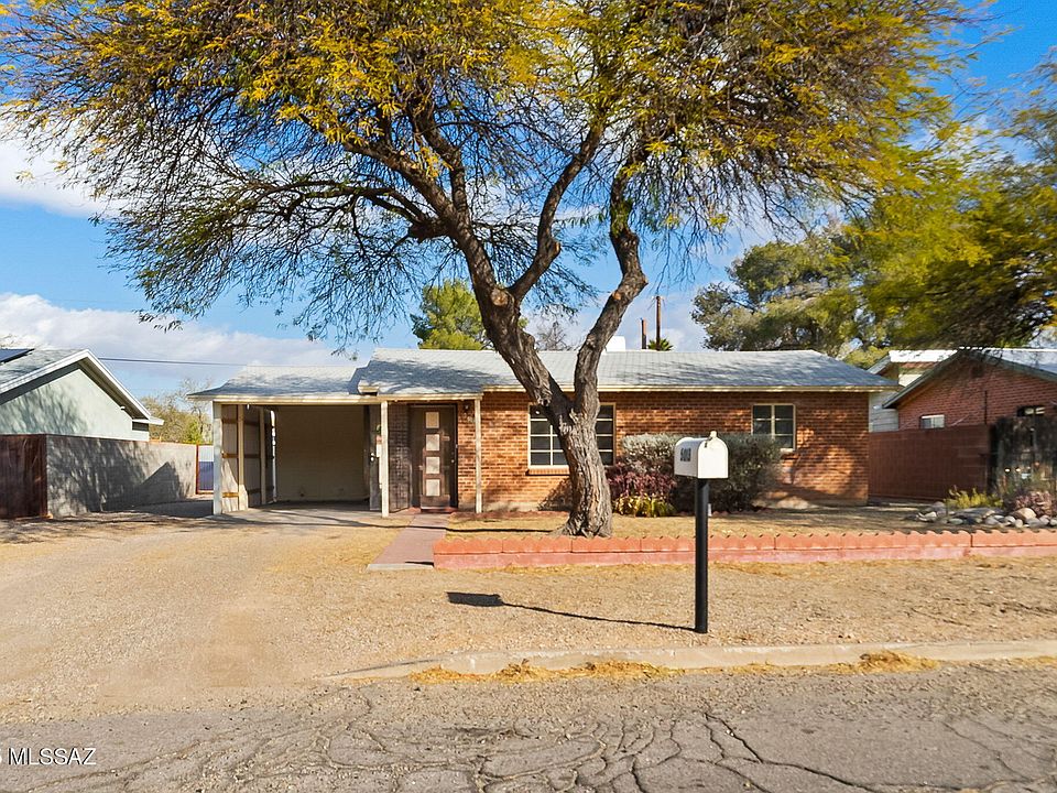 Mid-century brick charmer in Central Tucson! This 1201 sq. ft. home features 3 bedrooms, 1 bath & sits on a large lot. Primary suite is spacious & filled with light + 3 skylights. Updated bathroom boasts ceramic tile shower with river stone flooring. Detached laundry room boasts extra storage. Updated 200-amp electrical panel. North facing backyard offers privacy with block walls & brand-new corrugated steel fence. Storage shed with electric & concrete floored workshop. Double metal gates to backyard are great for RV parking, access or any of your toys. Beautiful mature mesquite tree gives the front yard lots of shade & curb appeal. All flat roofs re-coated. Close to University of Arizona, shopping, dining, Schools & entertainment. Fabulous investment opportunity or make it your own!!