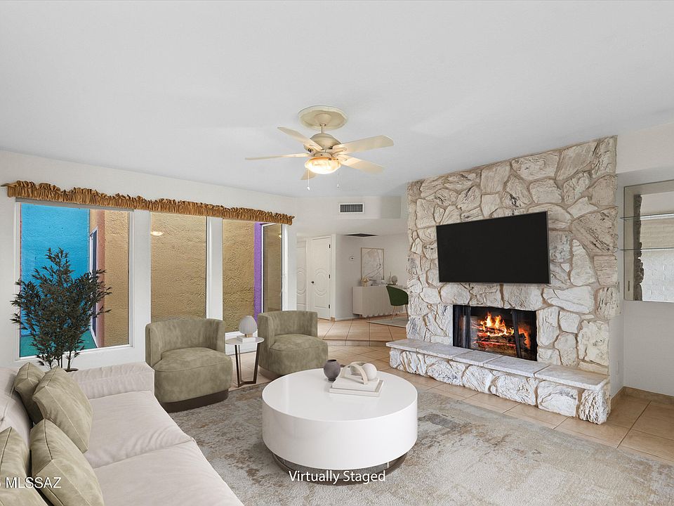 Single-level townhome in central Tucson with thoughtful updates and flexible spaces. The kitchen now features refreshed blue-gray cabinetry that adds a calm, modern tone to the home's open layout. The living area centers around a stone-facade gas fireplace and opens to a very private patio with lush landscaping and fruit trees. Sellers raised wall height to create a private retreat. Two enclosed, cooled atriums invite creative use for an office, studio, or plant retreat. Updated baths, tile flooring throughout, skylights, solar tubes, and triple-pane windows enhance comfort and efficiency. Community pool, spa, and front-yard care included. This quiet community features convenient access to shopping, restaurants, entertainment, medical care, and UA. An amazing central location! The community includes a gated pool, spa, and front-yard maintenance for a truly lock-and-leave lifestyle.