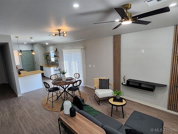 NEW CONSTRUCTION - Move in Ready! Great location with easy access to Tulsa Hills, I-44, I-244 & Hwy 75. Modern Cottage, 3 beds, 2 bath, 2 car driveway. Earthy organic interior design, butcher-block countertops, stainless steel appliances, covered porch. Tile and vinyl flooring throughout, private master bedroom with master bathroom and walk-in closet. Spacious backyard with Mature trees. Less than 10 min drive to Tulsa Hills, QT, restaurants & shopping. Chain link fence, security cameras included. House is surrounded by new construction homes; more similar houses coming soon on same street. Listing Agent is related to Seller.