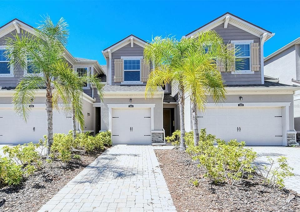 Interior freshly repainted, newer stove and refrigerator, this Azure unit offers an open floor plan on the main level with kitchen open to dining area and gathering room. The kitchen boasts granite counter tops, stainless steel appliances, 42' Cabinets and Crown molding. The master suite is located on the second floor with the two additional bedrooms and laundry room. The Master has a vaulted ceiling, walk in closet, dual sink, raised vanity and large shower. Driveway with pavers and brick pavers in screened lanai. Located in Harmony at Lakewood Ranch, you have use of the clubhouse with fitness center, seasonally heated pool, tot lot, walking trails and more. Quick drive to the grocery, shopping, golf and medical services. Make your home in this friendly family community. Also, a great investor property.
