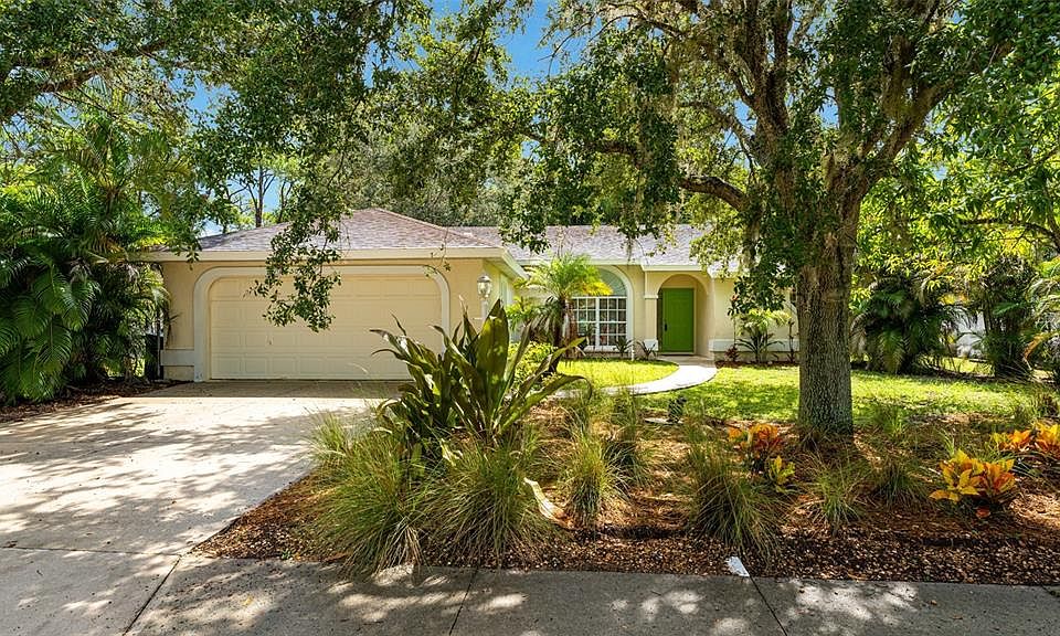 One or more photo(s) has been virtually staged. Check out the curb appeal of this lovely one-story block home in a quiet neighborhood called Hammock Place II. This deed restricted community has sidewalks and mature, beautiful oak trees and ponds with no CDD fee and a low HOA fee. Enter through the front door to an open floor plan that connects the living room, dining area and kitchen creating a large but warm area to enjoy family and friends. Features include vaulted ceilings, ceramic tile floors throughout for easy cleaning, large set of sliders to an enclosed lanai and outdoor patio overlooking fenced backyard and wooded area beyond. There is also a spacious primary bedroom suite with two walk in-closets, separate shower and garden tub, a split-bedroom plan of two generous sized guest bedrooms and another full bath. The two-car garage includes laundry hookups. Hammock Place II is centrally located and close to US 301, the Sarasota-Bradenton Intl airport, UTC mall, retail shopping, restaurants, and a short distance to downtown Sarasota and Bradenton and beautiful white sand beaches. I-75 is close which makes it convenient to commute to Tampa, St. Petersburg or points further north or south. Being sold as-is with right to inspect.