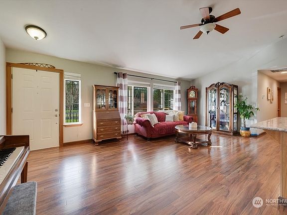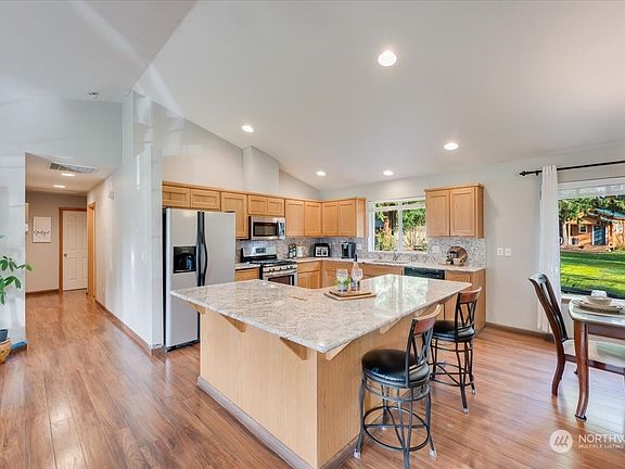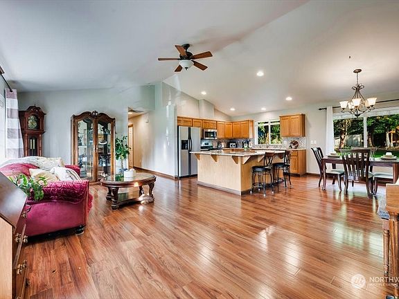 Gorgeous Kackman Creek Rambler with additional gravel parking, and behind the gate RV parking, plus a shop - all on on a fully fenced, flat, half acre lot. Inside, you'll find easy care engineered hardwood floors, vaulted ceilings, solid granite counters in the kitchen, a cozy rock fireplace in the family room, and AC for the summer heat. There's a new 50 gallon hot water tank, and refurbished crawl space. Don't miss the walk-in closet in the primary suite. The house backs to a greenbelt for privacy, with garden space, and a nice big deck. The neighborhood has 50 acres of walking trails, and is close to I-5, Hwy 9, and Angel of the Winds. Work from home? This house has fast internet and broadband! This house is ready for it's next owner!