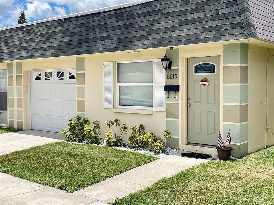 Home is nestled on a quiet side street in the heart of the 55+ active community of New Port Colony. The corner Villa is very close to shopping, restaurants and medical facilities. This spacious one bedroom one bath also features a finished one car garage that could easily be a second bedroom, office or craft room making it a great flexible space. Upon entry you first notice the beautiful engineered hardwood floor thought the living and dining room. The well appointed galley kitchen and bath was recently updated. Water heater replaced 2019. Air conditioning unit replaced 2022, Roof replaced 2019, Garage door replaced 2023. This unit has been very well maintained with some nice upgrades and very low annual expenses. Another great community feature is the ability to join the Gulf Harbors Beach Club. Exclusive membership can be purchased for a minimal annual fee granting access to the guard gated private beach and ability to reserve pavilions for private parties. Don't hesitate to schedule your showing today.
