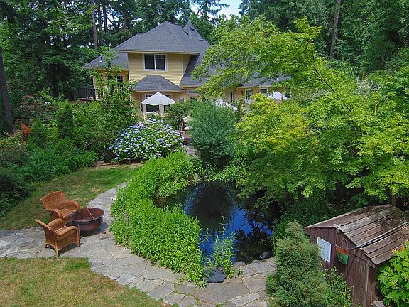 Come tour this take your breath away private view home w/: a gourmet kitchen, separate suites, flexible turret room & nooks! Amazing garden & wooded wonderland scenes surround this PNW hideaway for rare privacy. A dream come true for outdoor enthusiast's & artist's! An entertainer's heaven w/ balconies, patio & decks equipped w/ an outdoor cooking area & spa tub. Flower & food gardens, a serene pond, charming shed & side parking for a boat, etc. Near hospitals, school campuses, recreation & I-5!
