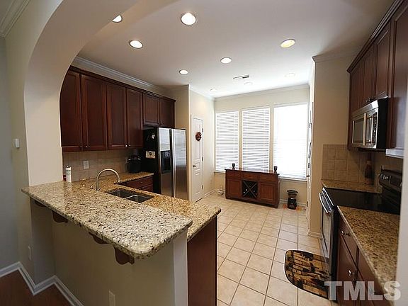 Gorgeous TH w/ GARAGE in highly sought after Glenwood North! FRESH paint throughout! Open floor plan. Kit w/GRANITE cntrs, ss appls, tons of cabs, two pantries. HDWDS on main flr. Fam rm w/ gas log FP, access to deck & WOODED back yard! Privacy in a TH?? YES! Mstr ste has trey clng, garden tub, sep shower. Downstairs bonus/4th BR has own full BA & entry to covered PATIO. Home is move in ready!! NEW HVAC! Nhood Pool incl in HOA dues! Easy access to 440, 40, Airport, & Crabtree Mall shopping and dining!