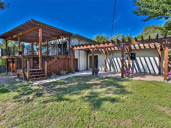 Spacious bi-level home on beautiful half acre lot with mature trees and privacy on the East side of the Springs! Entry greets you with natural stone tile and split levels. Red oak flooring on main level and large, open space with vaulted ceiling over kitchen, dining area and living room with gas fireplace, great lighting and outside, an inviting and sprawling deck. Kitchen features custom island, granite counter tops and two black granite sinks with disposals. Five garage spaces...2 car attached and 3-car detached garages. Master has it's own deck and a walk-in closet and en suite bath with beautiful Travertine tile, jetted tub, stand alone shower. You'll enjoy having some mountain views from the master and the deck. Cork flooring on lower level to cozy family room with pellet stove, laundry and two more bedrooms. Loads of storage in 28' x 14' space under deck, surrounded by handmade lattice...great for storing lawn mowers and larger items. Substantial pergola over deck and back patio.