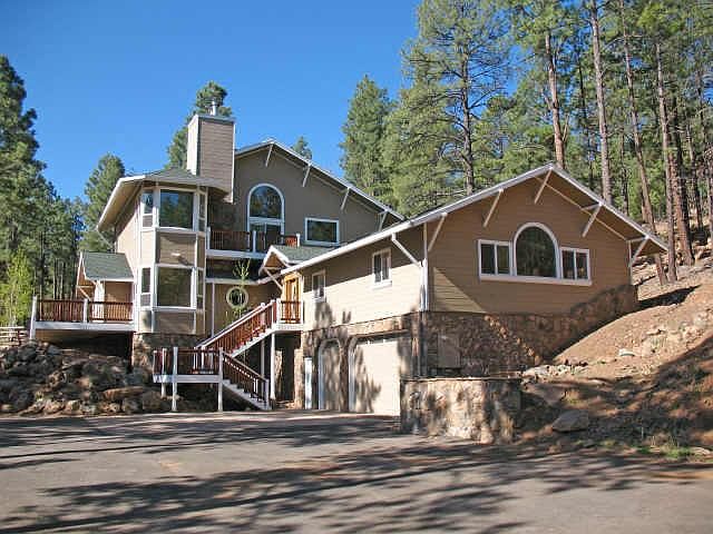 WOW!!! A HUGE Price Reduction!! Custom built home in the Ponderosa pines of Flagstaff. It sits on 2+ acres & has panoramic views of the S. F. Peaks & surrounding forests. A large 6 bed, 3 bath, 3 car gar home that boasts 5000+ sq. ft. of living space. The kitchen, living room, & dining room have 10 ft ceilings & a moss rock fireplace. The master suite has a master bath, a wood stove fireplace & access to the master deck. It has a dynamic hydronic heating system, Italian tile, & knotty alder woodwork. This home is 10 min from town, & is close to skiing, mountain biking, hiking & the forest. Motivated Sellers say, 'Sell this Property'!