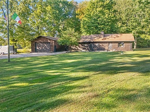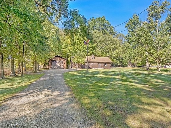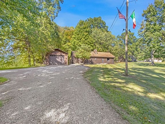 Welcome to this charming rustic log cabin ranch in Lowellville, set on a peaceful 1-acre wooded lot. This home features an open-concept design with log-beamed vaulted ceilings, a stunning floor-to-ceiling stone wood-burning fireplace, and modern updates perfect for outdoor enthusiasts. The kitchen offers a breakfast bar that opens seamlessly to the dining and living areas, creating a perfect space for gatherings. A private wood deck off the kitchen overlooks open fields and wooded area, ideal for quiet relaxation. Tin accent walls throughout add rustic charm. The large, extra-tall 4-car detached garage is fully equipped with electric and lighting, offering ample space for tons of outdoor toys and tools. The basement also provides additional space ready to be finished for entertaining or storage. Updates include new cement sidewalks, a lean-to garage, a new furnace (2024), a new hot water tank (2023), and a remodeled bath. Additionally, the property features updated 200-amp electric service and newer appliances. This unique property combines rustic living with modern conveniences in a beautiful, serene setting!