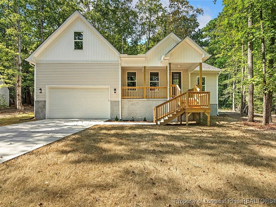 This lovely new construction home is located in the friendly gated and golf community of Carolina Trace. This spacious and practical layout with 3-bedroom with finished bonus/4th bedroom over the garage. This home is centrally located between Raleigh and Fort Bragg boasts extraordinarily high ceilings, LVP, and tile throughout, a spa like master suite with a luxurious tile shower, a separate soaking tub, and 2 walk-in closets. The kitchen is highlighted with plenty of cabinet space, a breakfast bar, quartz countertops, and a subway tile backsplash. The mud room is located is with the laundry and additional storage on the first floor. The wrought iron staircase leads to the bonus room with closet or 4th bedroom. Carolina Trace is home to two golf courses designed by Robert Trent Jones, wonderful fishing, kayaking, boating, bird watching, swimming, and plenty of other outdoor activities. Mallard Cove includes a community pool and tennis courts.