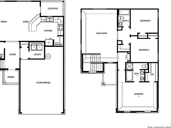 The Wooden is a two-story, 2037 square foot, 3-bedroom, 2.5 bath, 2-car garage home. The inviting entryway and powder room lead to the spacious living area on the first floor. The living area opens to a cozy breakfast nook and an open kitchen with quartz countertops, stainless steel appliances, classic white subway tile backsplash, and spacious corner pantry with shelving. A utility room is conveniently located off the foyer and a covered patio (per plan) is located off the family room. Head upstairs to find an airy & versatile loft, all three bedrooms, storage space, and two full bathrooms. The large secluded main bedroom & ensuite features ceramic tile flooring, walk-in shower, garden tub, dual vanities, and walk-in closet. Other features include 2-inch faux wood blinds throughout the home, 9-foot ceilings, luxury vinyl plank flooring in the entry, family room, kitchen, and dining area, ceramic tile at all bathrooms and utility room, pre-plumb for water softener loop, and full yard landscaping and irrigation. You'll enjoy added security in your new home with our Home is Connected features. Using one central hub that talks to all the devices in your home, you can control the lights, thermostat and locks, all from your cellular device.