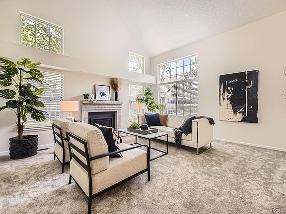 Rare ranch-style townhome in a peaceful, gated community—Beautifully Updated with spacious main-floor living, modern finishes, abundant natural light, and seamless indoor-outdoor flow. With 2,314 finished square feet, this inviting 2-bedroom, 2.5-bath home has been refreshed with new paint, carpet, light fixtures, window coverings, and hardware—creating a bright, move-in ready space. The vaulted living room, complete with gas fireplace and views of the community open space, flows into the dining area—just one step above and defined by a pony wall—creating a connected yet subtly separated layout. Soaring ceilings enhance the open, airy feel, perfect for daily living and entertaining. A passthrough between the dining room and kitchen makes hosting easy, and the eat-in kitchen offers white cabinetry, granite countertops, a pantry, and direct access to a private patio with gate to the green space—perfect for summer evenings under the stars, surrounded by mature trees and well-kept grounds. The main floor includes a vaulted-ceiling primary suite with skylit en-suite bath featuring a jetted tub, dual vanities, and a generous walk-in closet. A second bedroom, full bath, and laundry room complete the main level. Downstairs, the finished bonus room offers flexible space for a media room, gym, guest suite, or hobbies, along with a half bath and large storage room. Additional highlights include a two-car attached garage, newer water heater, and guest parking right out front. Residents enjoy access to a private pool, renovated clubhouse, and beautifully maintained grounds. Ranch-style homes in this neighborhood are rarely available—especially with this much finished space. Enjoy foothill views, easy access to C-470, and nearby shops, restaurants, and recreation including Harriman Lake.