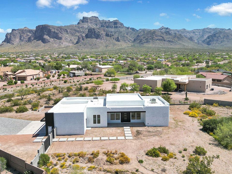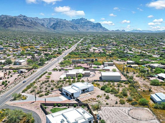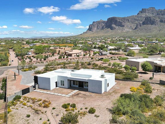 Gorgeous ''Mountain Modern'' home! Open floor plan w/ over 2,300 sqft of luxury living space; 4 bds, 3 ba, 3 car garage, new flooring, & quartz countertops throughout! Entertainer's kitchen w/ walnut cabinets, a vast island, RO water system & effortless flow. Split floor plan offers HUGE master bath w/ custom walk-in shower, dual floating vanities, & w/d hook ups in the large walk-in closet. Exterior block and steel view fencing & dual-exit paver driveway compliment the modern style. Unobstructed, spectacular views of Superstition Mountains from nearly every room! A spacious 1.10 acres w/ fully fenced backyard and NO HOA has abundant room for a detached casita, workshop, garden, pool, or animals--INCLUDING HORSES! Don't miss this! Seller related to Agent