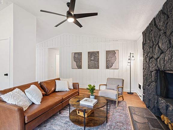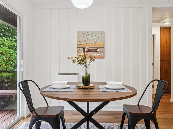 A truly turnkey, one-level home where every detail has been thoughtfully updated. New roof, new double-pane vinyl windows, new electrical panel, new plumbing, new water heater, fully remodeled kitchen and bath, new paint, and new luxury vinyl plank flooring. Step into the inviting living room with vaulted ceilings, a wood-burning fireplace, and a big picture window that looks out over the front yard. The dining nook features a sliding glass door that opens to a freshly refinished deck. In the kitchen, you'll find beautiful quartz countertops, a tile backsplash, new cabinets, and all-new stainless steel appliances. The bathroom has been fully remodeled and sparkles with tile flooring, a new vanity, and new fixtures. Both bedrooms have large closets and plush carpet for an extra cozy feel.The fully fenced backyard is perfect for entertaining, complete with a refinished deck and tall shade trees that offer a peaceful, private setting. The two-car garage has a brand-new door and electric opener. Nestled in the tranquil Ash Creek neighborhood and surrounded by greenery and beautiful parks, this home is just two blocks from a Woods Memorial Park trailhead. Shopping, coffee, and restaurants are nearby in Multnomah Village and Garden Home. [Home Energy Score = 2. HES Report at https://rpt.greenbuildingregistry.com/hes/OR10237767]