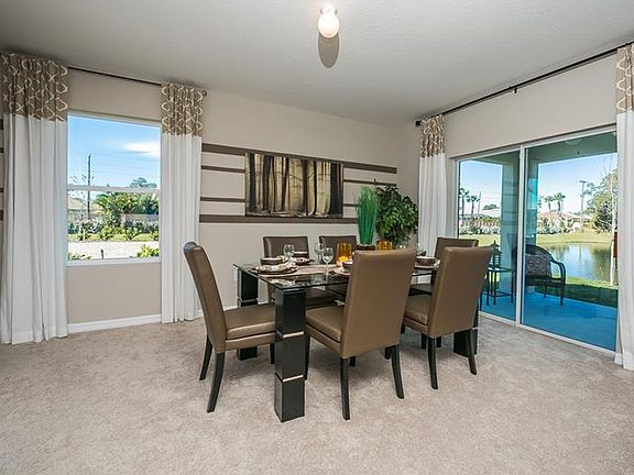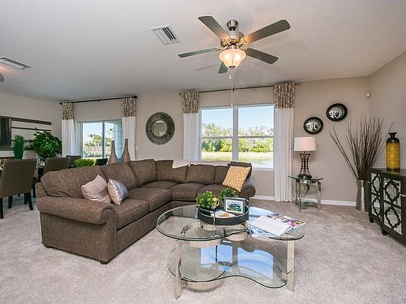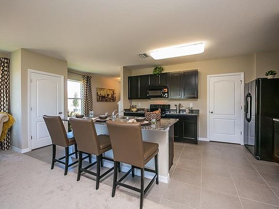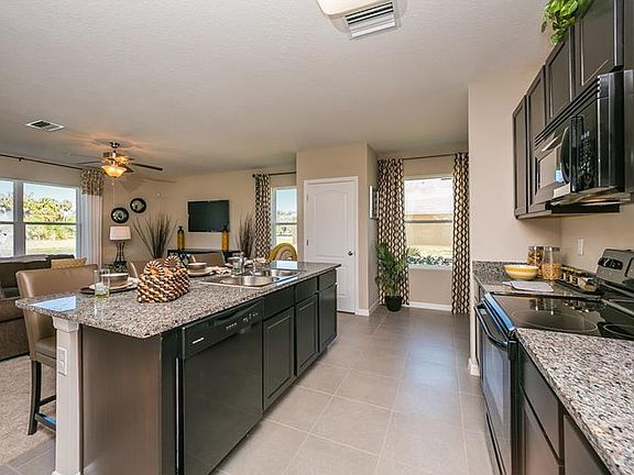 The Elston model is a modern Spanish-style two-story home with 4 bedrooms, 2.5 baths, 2-Car garage. Open concept design feels spacious and welcoming. A covered entry porch leads into a foyer then to a bright and open great room with lots of windows. Double sliding glass doors across the back of the house look out to the covered lanai. The modern equipped kitchen has a large granite center island perfect for bar-style dining, meal preparation, serving and entertaining. Lots of tall cabinets, huge walk-in pantry, coat closet and under stair storage provides tons of storage. All new appliances included: smooth-top range, microwave hood, dishwasher, side by side refrigerator with ice and water in door. Washer and dryer included and conveniently located upstairs in separate laundry room. Spacious master suite can easily fit a king size furniture set and has a truly huge walk-in closet. The en-suite master bath has a double vanity, linen closet, additional clothes closet and separate water closet. The other 3 bedrooms share a hall bath with double vanity. There is also a loft for den, office or play area. Move-in ready home comes with blinds on all windows.