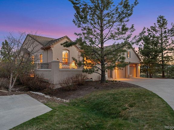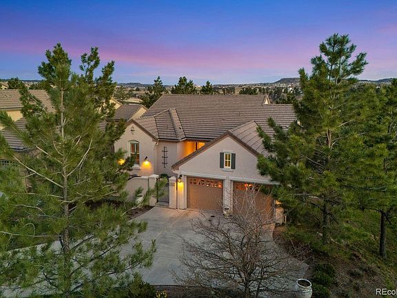 This meticulously maintained 3 bedroom | 3 bathroom home located in a gorgeous enclave in the coveted Village at Castle Pines community immediately draws you in with beautiful custom finishes. Showcasing hardwood floors and plantation shutters throughout, and just a short walk from the Canyon Club pool and Village Lake fitness center, every detail will be appreciated. The well-equipped kitchen includes a breakfast nook with access to the inviting back deck with mountain views and sits adjacent to a cozy family room with gas fireplace. The dining room is perfect for four seasons gatherings of family and friends. The tranquil main level owner's retreat offers a two-sided gas fireplace, private access to the deck and a sizable bathroom with his | hers vanities, soaking tub, large glass-faced shower, and two walk-in closets. A rare conforming main level 2nd bedroom is adjacent to a full bathroom. A quiet office with glass doors, wainscoting accents, and custom floor-to-ceiling built-ins, as well as a laundry room and garage complete the main floor. The finished walk-out basement is an entertainer’s dream. A full eat-in kitchen is ideal for hosting guests and gatherings, while the adjacent dining | sitting area and family room offer ample space for relaxation. Access to the lower level patio, also with mountain views, a guest bedroom, an additional full bathroom, and large unfinished storage space round out the lower level. While the interior of this lovely house offers a beautiful flow, the fantastic outdoor spaces accentuate the appeal from the outside in. Highlights include a front patio with courtyard style entrance, sizable upper deck and covered lower patio at the back of the home, which provide abundant opportunity to enjoy the Colorado beauty, from serene mornings to sunset dinners. Walkable to restaurants, shops, tennis, pickle ball courts, pool and fitness center, this spotless home offers an immediate opportunity to inhabit a gorgeous property today!