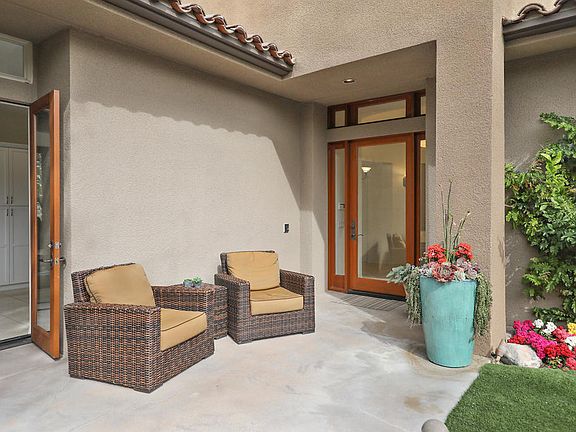 Take a deep breath as you soak in exceptional views from this lovely 2,828 square feet, 3 bedroom, 4 bathroom single family home within the dramatic natural setting of The Reserve. Located on a waterway with panoramic views overlooking an eighteen hole putting green and mountain ranges beyond. The great room boasts walls of glass that frame the Santa Rosa mountains. The kitchen has newer appliances and two sets of french doors to the beautifully landscaped private entry courtyard and to the outdoor cooking and living/entertaining areas. Custom built-ins and cabinetry, nice flooring, and granite counter tops are just some of the fine features in the welcoming home. The wraparound patio overlooks the lake with 3 waterfalls. This property is close in proximity to the world class Reserve Village and amenities, championship eighteen hole golf course including three trophy holes, casual and fine dining, lap pool, tennis, pickle ball, hiking, dog park, wellness center with group classes, full spa complete this perfect desert retreat! Less than five minutes from El Paseo, 'The Rodeo Drive of the Desert' which includes shops, restaurants and galleries alike.