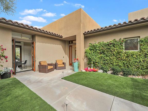 Take a deep breath as you soak in exceptional views from this lovely 2,828 square feet, 3 bedroom, 4 bathroom single family home within the dramatic natural setting of The Reserve. Located on a waterway with panoramic views overlooking an eighteen hole putting green and mountain ranges beyond. The great room boasts walls of glass that frame the Santa Rosa mountains. The kitchen has newer appliances and two sets of french doors to the beautifully landscaped private entry courtyard and to the outdoor cooking and living/entertaining areas. Custom built-ins and cabinetry, nice flooring, and granite counter tops are just some of the fine features in the welcoming home. The wraparound patio overlooks the lake with 3 waterfalls. This property is close in proximity to the world class Reserve Village and amenities, championship eighteen hole golf course including three trophy holes, casual and fine dining, lap pool, tennis, pickle ball, hiking, dog park, wellness center with group classes, full spa complete this perfect desert retreat! Less than five minutes from El Paseo, 'The Rodeo Drive of the Desert' which includes shops, restaurants and galleries alike.