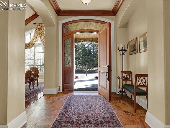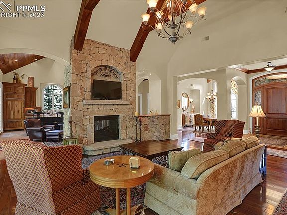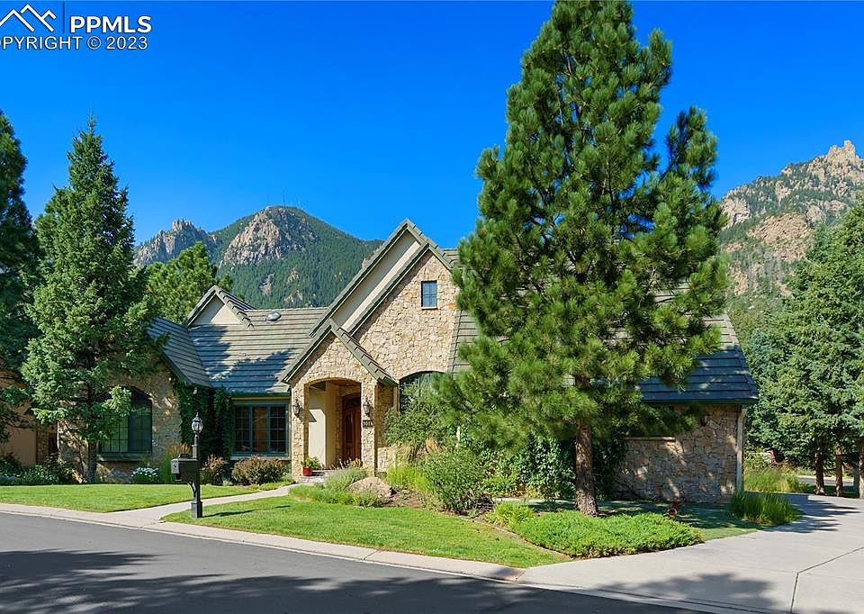 Exceptional Mountain Retreat in the manned gated Broadmoor Resort Community, a short drive to the world renowned Broadmoor Hotel. This custom extraordinary home is impeccably cared for, in move-in condition, featuring the highest quality construction: extensive natural limestone on exterior and interior, most comfortable and efficient in-floor radiant heat throughout, beautiful cherry wood flooring and trim work on main level, covered patio adding outside entertaining space, open design floorplan with soaring cathedral ceilings, walls of windows providing loads of natural sunlight. Details include custom architectural millwork, cherry beams, thick cherry doors, stone and structural arches, formal dining room, office with custom cherry built ins and coffered ceiling, main level laundry room with many built-ins. The gourmet kitchen showcases tongue & groove cherry vaulted ceiling with hearth room area. Professionally equipped with SubZero, Dacor, Thermador, Wolf, Bosch, Thermador appliances, granite countertops, custom cherry cabinets, farmers sink and vegetable sink, warming drawer, wine cooler, walk-in pantry, expansive center island, eat-in kitchen nook, dramatic custom & natural lighting. Main level master suite with luxury bath, air-jetted tub, seamless glass shower, separate vanities, enclosed gas fireplace, and well-appointed walk-in closet. Lower level has 9 foot ceilings, is designed for entertaining with recreation room, wet bar, temperature controlled wine room, theater-all equipment stays , custom stone work, additional bedrooms, loads of storage space and flex room that would great for the hobbyist. The lower level 5th Bedroom is non-conforming. This home is situated on a private lot amongst the majestic mountain backdrop of breathtaking views. An exclusive gated community with the option to join the Broadmoor Golf Club and Spa.