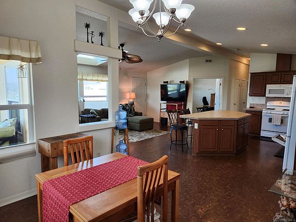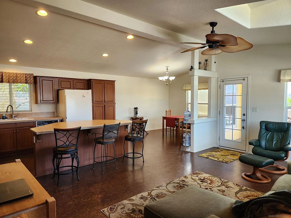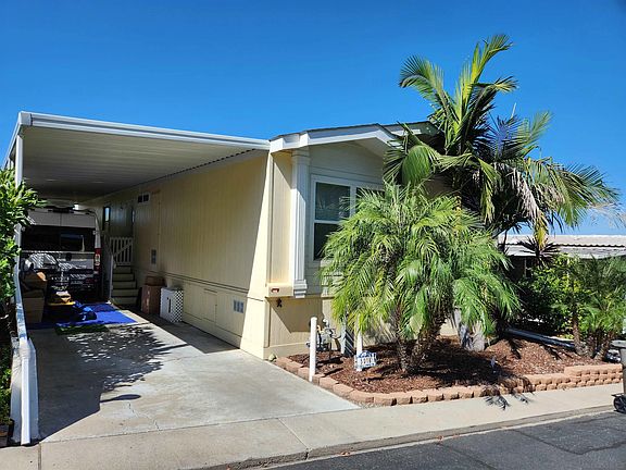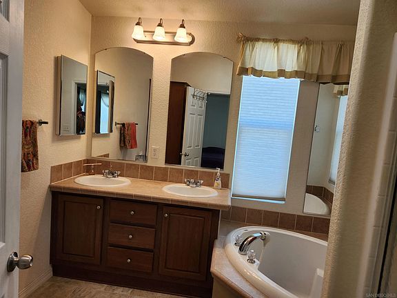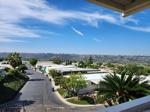 Stunning Views of Mission Gorge, the Golf Course, & Sunsets! Move-in ready 2008 Goldenwest Manufactured home with a Den. Located in The Cliffs Senior community in the heart of San Diego. The interior features an open floor plan with vaulted ceilings, north facing dormer, ceiling fans, and up/down shades! Huge kitchen perfect for entertaining, ample cabinets, spacious counters, color coordinated tile backsplash and large island. All appliances stay – microwave is brand new! The utility room has a stackable washer and dryer. A huge den is just off the living room and makes a perfect office! Spacious primary bedroom easily accommodates a king size bed features a walk-in closet, and a en suite with 2 sinks, soaking tub, and a shower! The guest bedroom also has great natural lighting, nice sized closet with bathroom and tub/shower just across the hall. In the back yard you can meander on the DG pathway through the 8+ mature fruit trees or sit on the Covered Deck! Includes a custom built 7 x12 shed. Don’t see if you’re not ready to fall in love! Call Today! (LBK2735)