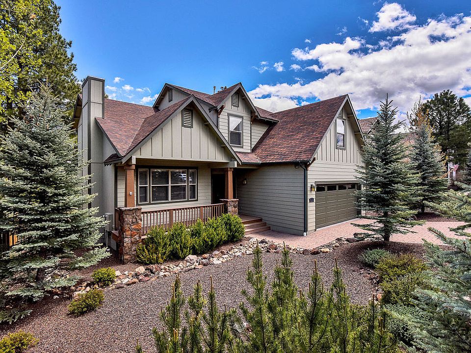 Pristine 3 bedroom home with a bonus room is move in ready. Desirable location in Ponderosa Trails that backs to GREEN BELT. Enjoy Flagstaff's weather in the serene back yard. Huge deck and a maintenance free landscaped yard. a front deck too with views of the Peaks. This home has so much to offer, as you walk into this craftsman style home you have a heart warming stone fireplace, vaulted ceilings, laminate wood flooring and a gorgeous kitchen. The kitchen includes solid surface granite countertops, Kraftmaid maple cabinetry and a stainless steel appliance package. Upstairs your find new carpet, 2 spacious guest rooms, bonus area and the relaxing master suite. The master is dreamy with vaulted ceilings, adjoining bathroom with dual sinks, separate shower, tub and walk in closet.