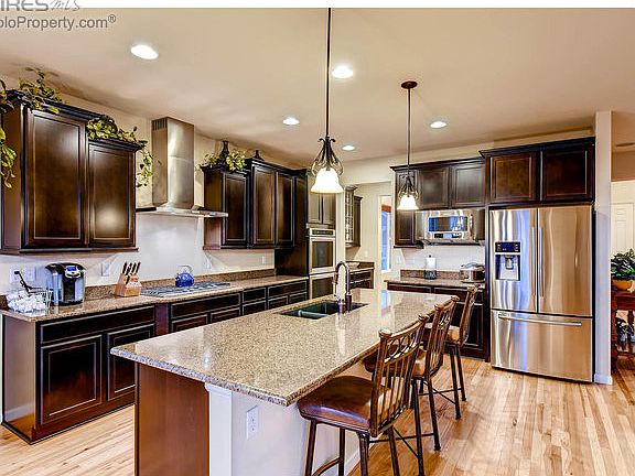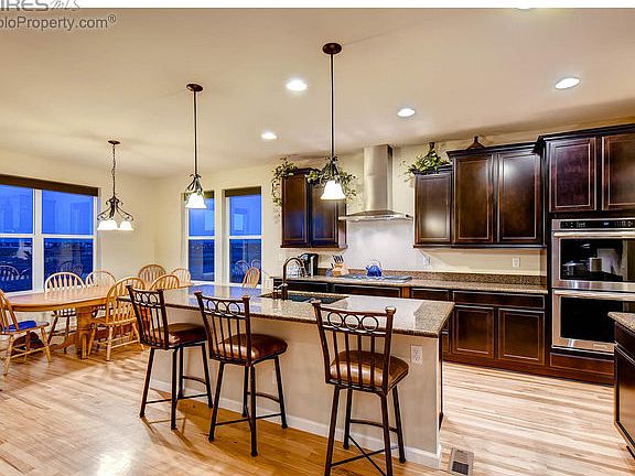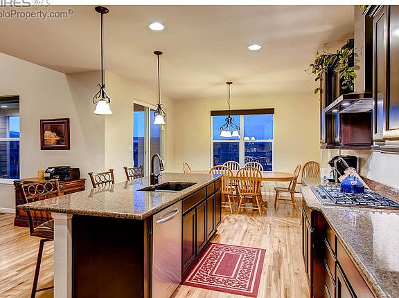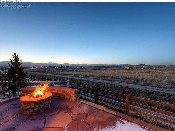 Watch the sun rise on Longs Peak from your breakfast table in this wonderful home with soaring vaults backing to a City Park. Wood floors across entire 1st floor & a very open floorplan with great room & 9' ceilings on main level. Upgraded stainless appliances, slab granite counters/island & butler's pantry. 3 bedrooms up plus a loft that can easily be a 4th bedroom up. Main floor bedroom with adjacent 3/4 bath could also be study. Covered porches front & rear plus flagstone patio with fire pit.