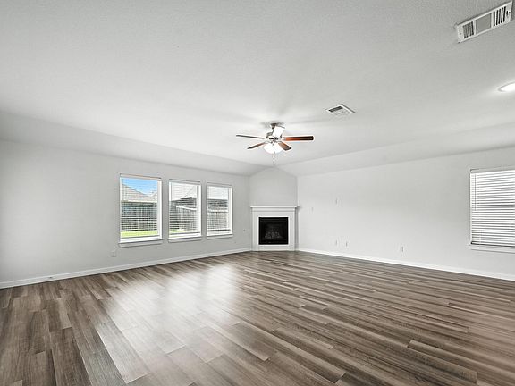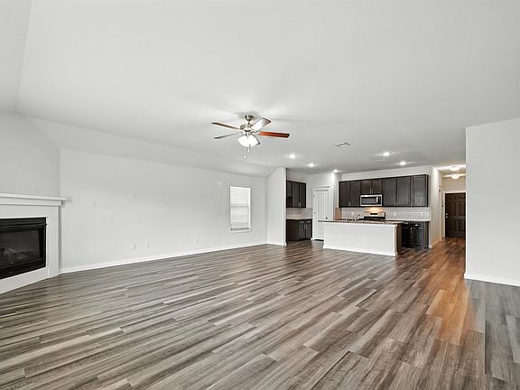 Enjoy cozy evenings by the fireplace in the living room, or unwind in the private primary suite that feels like a retreat. The primary bath is designed with relaxation in mind, offering a double-sink vanity and modern finishes, while the walk-in closet provides plenty of storage. Ceiling fans throughout the home enhance comfort and energy efficiency, and the dedicated laundry room makes household chores simple and convenient.
