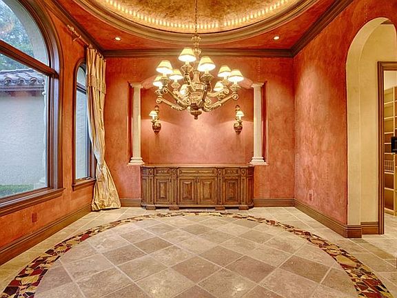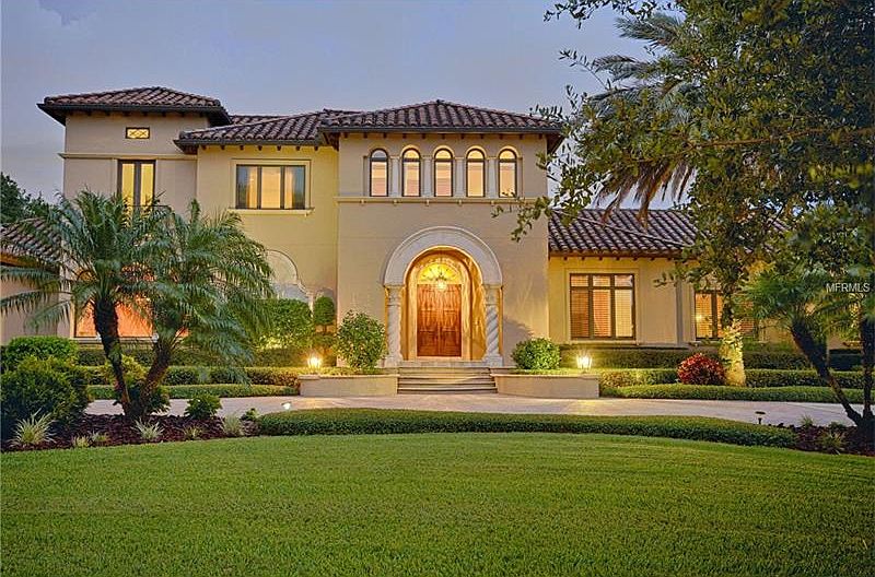 Featured in Florida Design Magazine, this two-story residence on a double lot behind Isleworth’s 6th green is a prime example of Old World European design with Venetian plaster walls, marble floors with mosaic inlays, wood-beamed ceilings and handcrafted distressed cypress doors. With four bedrooms, four full and two half baths, this home makes a stunning first impression with a columned and groin-vaulted gallery off the foyer and a formal living room with a limestone fireplace, walnut floors and a stenciled and wood-beamed ceiling. Ruby-red Venetian plaster walls and a gold-leaf ceiling evoke a rustic elegance in the formal dining room with nearby wine cellar. The gourmet kitchen is enhanced by many high-end features and finishes, including chiseled-edge limestone countertops, a butler’s pantry, two massive islands and a breakfast room with corner sliding glass doors. The adjoining family room with walnut floors, wood-beamed ceilings and a built-in entertainment center opens to the beautiful summer kitchen, lanai with fireplace and an expansive pool with spa. The master suite has superb views of the pool and features a luxurious spa tub, large shower, vanity and oversized closet. A library, three upstairs bedrooms, a loft with custom built-ins, and a Lutron lighting system are additional highlights. Lot size is suitable to build a guest house.
