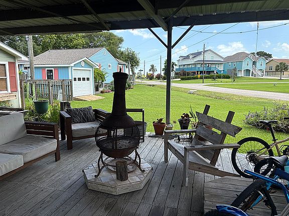 Quaint beach home in beautiful and sought after El Jardin subdivision. Just 2 blocks from the bay with a private beach side with access for homeowners, you can hear the waves and smell the salty air from the spacious front porch with expansive views of greenery and deer. This is a cozy home with upgrades of crown molding throughout most of the home and stainless steel appliances, custom wood trimming touches throughout the home with granite countertops and beautiful granite and rock decor walls. Large living room and plenty of outdoor seating on multiple porches/deck's and an open concept shop garage with plenty of room for a vehicle or golf cart and lots of storage. Office and half bath are in the shop garage. Multiple custom cabinetry and storage options added as well. Situated on a lot and a half and a corner lot with two driveway’s, you feel almost secluded in the oasis of this safe and adorable beach bungalow home. CCISD school district and a short drive to the Kemah Lighthouse District. Also within walking distance to Pine Gully and the beautiful Seabrook trails.