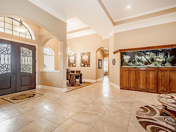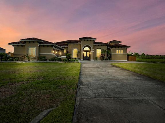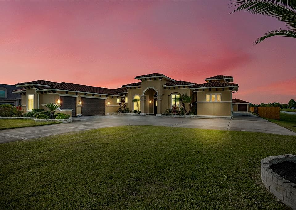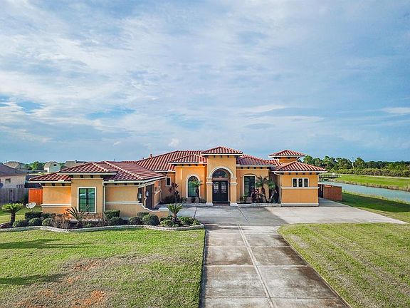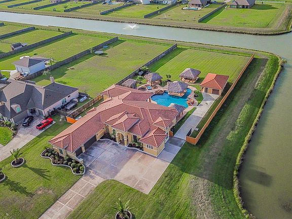 This extraordinary lake view property on over an acre has it all and takes living in style to a new level! This palatial home offers a magnificent primary bedroom ensuite, as well as 3 other bedrooms, an office, a workout room with gym flooring, and a craft room. The detached mother-in-law suite, built in 2018, has central air, wood-like tile, and LED lights. The projector and screen in the living room make for an epic movie night. The backyard private oasis offers a remote-controlled pool & spa with a swim-up bar. In addition, you'll enjoy an outdoor kitchen area, showers, and 2 bathrooms. Tiki-style palapas come with heaters & TVs for ultimate entertainment. Upgrades inside the house include decorative tray ceilings, oversized closets, water softener, blown-in insulation, pre-wiring for cable & internet, a built-in fish tank, and foundation footers 4ft in the ground. The property did NOT flood during Harvey. Easy access to SH-288. Turn your dream into reality with this stunning home!
