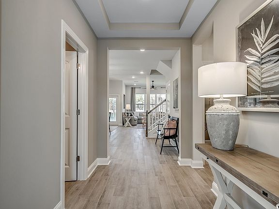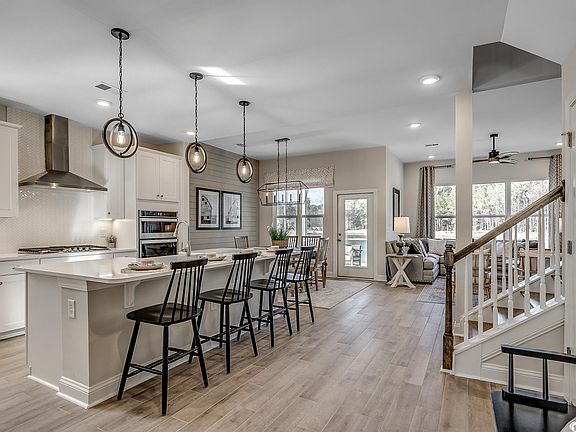 This gorgeous Mulberry home boasts upgraded features and a lovely waterfront backyard. The Gourmet kitchen includes white Level 3 cabinets with glass mullions, Quartz counter tops, stainless steel Whirlpool appliances (exhaust hood vented outside, natural gas cooktop, dishwasher, wall oven, and wall microwave), a Kohler apron sink, Moen plumbing fixtures, Mohawk Rev Wood laminate flooring, upgraded Daltile tile and Progress lighting throughout. The primary bath of this home boasts a 5ft walk in tile spa shower with a Moen rain shower head and wall shower head, a glass enclosure, and a dry off bench. An EnergyStar certified, Indoor AirPlus EPA Qualified home featuring the full Tyvek house wrap system, spray foam insulation, and an ERV-Energy Recovery Ventilation Fresh Air System which will create a healthier indoor environment, less moisture, less pests, and a lower energy cost. The kitchen, dining room, covered porch, and primary bedroom enjoy incredible lake views. Pictures are of a decorated Mulberry model with similar colors and features. Amenities galore: community pool, clubhouse, exercise room, catering kitchen, and gathering area.