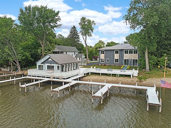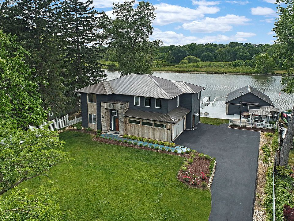 Welcome to your dream home nestled along the picturesque Fox River. This exceptional property offers a unique blend of luxury, functionality, and breathtaking natural beauty. Boasting three bedrooms, 4.5 baths, exercise room, a den, and an office. This one-of-a-kind residence is a haven for both relaxation and productivity. Situated on the riverfront, this home presents an unrivaled opportunity to immerse yourself in the tranquil ambiance of flowing waters. With 10 piers and a private beachfront, you can enjoy endless aquatic adventures and create cherished memories with family and friends. The panoramic views from this residence are truly awe-inspiring. Across the river lies a protected wetland, providing an ever-changing backdrop of natural splendor. Immerse yourself in the sights and sounds of nature as you unwind in the serenity of your own backyard. A distinguishing feature of this property is the completely reconstructed boat house. This versatile space can be your ultimate retreat, a man cave, a she-shed. Adorned with accents of reclaimed wood and featuring a magnificent tigerwood fireplace surround, the boat house exudes warmth, character, and a touch of rustic charm. The main house, a true gem, built brand new from the ground up in 2021, ensuring modern conveniences and amazing finishes throughout. Spanning over 3,200 square feet, every inch of this residence has been thoughtfully designed to maximize both comfort and aesthetic appeal. The open floor plan seamlessly connects living, dining, and kitchen areas, creating a harmonious flow and an ideal space for entertaining. Luxury and energy efficiency meet in this home, as it features tankless water heaters and radiant floors in both the main house and the boat house. Prepare to be enveloped in warmth and comfort during the colder months, while also benefiting from the cost-saving advantages of these modern amenities. The grounds surrounding this property have been professionally landscaped, adding to the overall allure and enhancing the natural beauty of the surroundings. Immerse yourself in a meticulously manicured oasis that complements the stunning riverfront location. Outdoor entertaining is a delight with the expansive deck that offers ample space for hosting memorable gatherings. Imagine enjoying al fresco dining, soaking in the sun, or simply relishing in the panoramic river views. Additionally, a patio with an awning and wet bar extends your living space, allowing you to savor the outdoors in style and comfort. Don't miss your chance to own this extraordinary riverfront retreat. With its exquisite finishes, remarkable amenities, and unparalleled views, this home offers a truly incomparable living experience. Embrace the serenity and beauty of the Fox River, and indulge in a lifestyle that truly reflects the pinnacle of luxury.