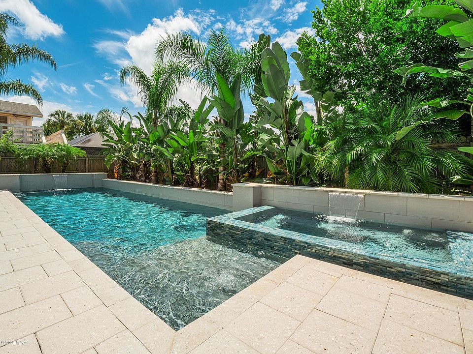 Incredible POOL home in Jacksonville Beach is a short walk to the Ocean! This newer built home is move in ready with over 2400 sf, 4 bedrooms & 2.5 bathrooms. The oversized corner lot boasts the ultimate Florida backyard complete with coastal inspired pool, large spa, water features, summer kitchen with grill, beverage fridge & your own beer tap! Fully fenced yard has ample room to play and perfect for your furry friends! The open concept floor plan has large kitchen and living spaces and an abundance of windows bringing the outdoors in with infinite natural light. Upstairs are all bedrooms and 2 full bathrooms. Tile flooring, tray ceilings and more. Live the beach life & walk to the beautiful white sand beaches, shops & restaurants.