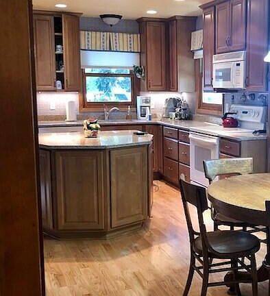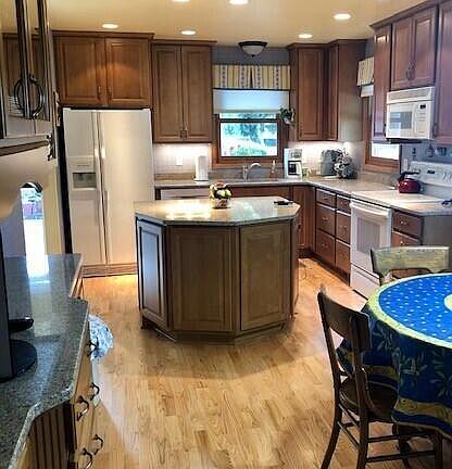 4 bedroom, 2 bath ranch style home on quiet street with lovely landscaped yard, mature trees & paved patio. Home has a custom island & kitchen cabinets & beautiful hardwood floors. Custom window treatments. Home warranty included.