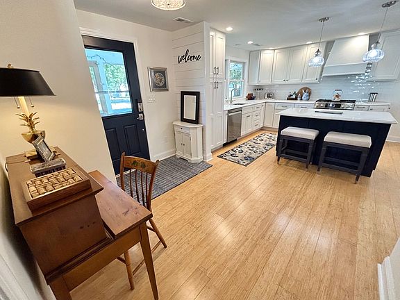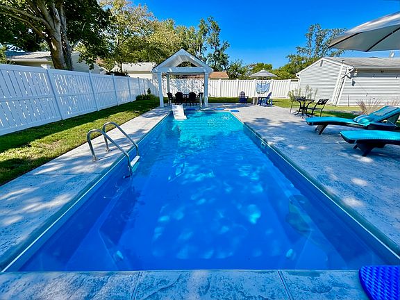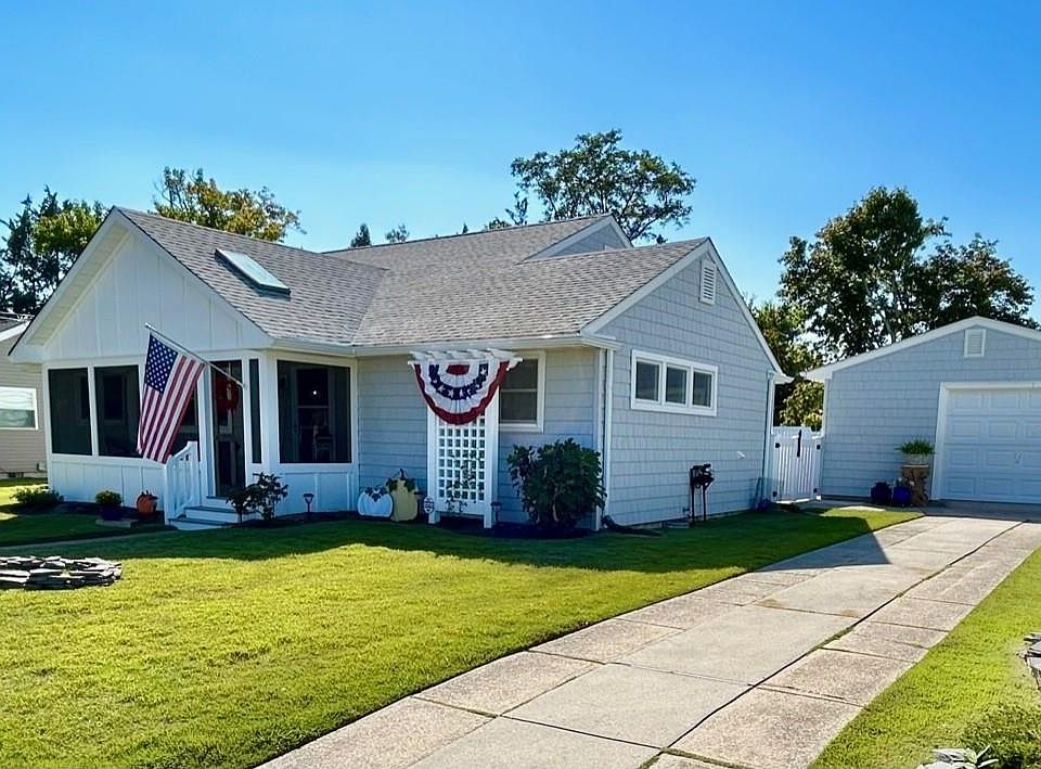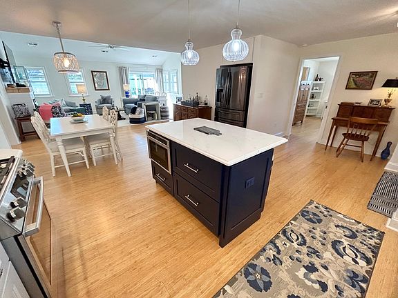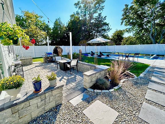 Three bedrooms, two full baths, completely renovated rancher with a stunning backyard just steps to the bay. This home was professionally designed for summer entertaining and year-round living with upgraded finishes. The front of the home has a screened-in porch opening to a large kitchen with quartz counters and high-end appliances. There is an expansive great room with solid bamboo flooring, vaulted ceilings, a gas fireplace, 75” TV, large Anderson slider and Anderson low-E windows. The primary bedroom has a California closet, an ensuite bathroom with an oversized tile shower and double sinks plus a laundry room. On the other side of the house there is a designer hall bath and two spacious guest bedrooms, one with a built-in murphy bed. The backyard includes an EP Henry paver patio with a knee wall and gas fire pit, 1½ car garage and privacy fenced yard. The yard also has a stunning two-year old fiberglass-heated, saltwater pool with lighting and open-air cabana.