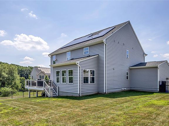 What an elegant home with so many artful upgrades throughout! The custom designed great room has built-in bookshelves and cabinetry complete with lighting. The fireplace has a new custom mantle and tile surround added. The kitchen has been updated with quartz counters, cabinet lighting, upgraded trim, an Elkay quartz composite sink, a Kohler faucet, a new Miele dishwasher, a reconfigured island and new hardware are some of the impressive changes you will see here! Custom window casing was added throughout the home. Solid oak flooring runs throughout the first floor, in the upper hall and master suite! The dual owner's closets allow for abundant storage. The finished lower level has built-in shelving & storage, a full bath, and an addtl 15x15 room. Also included is a fully owned solar panel system! Addtl information available. A Trex deck & upgraded fence complete the picture! Fabulous lot backs to the trees. Just minutes from historical Harmony and Zelienople, I79, shopping ad schools!