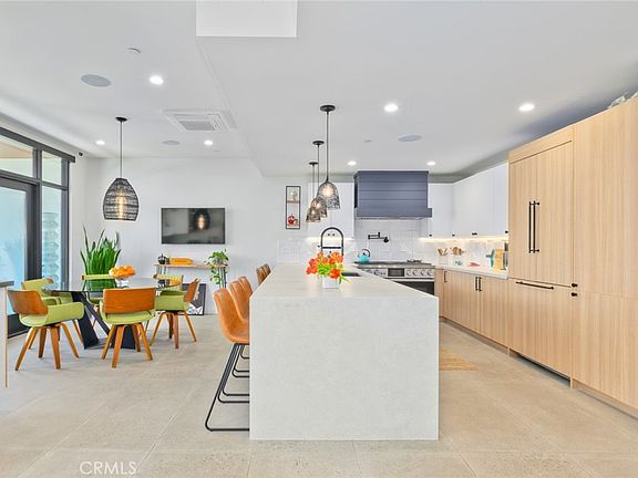 Step inside to find a bright and airy open-concept living space featuring clean lines, sleek finishes, and high ceilings throughout. The gourmet kitchen is outfitted with top-of-the-line Dacor appliances, quartz countertops, and custom cabinetry perfect for culinary enthusiasts and entertaining guests. The adjacent dining and living areas flow seamlessly, creating a warm and inviting environment for both relaxing and socializing.