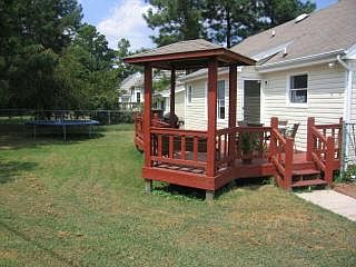 Charming 1-story home in Carrington Woods; open layout includes great living room w/ chair rail & brick fireplace, spacious kitchen w/ pantry & 42" cabinets, and bright dining area w/ ceiling fan & tile floor; master bedroom w/ ceiling fan & private bath; huge deck; fenced back yard; storage room + storage shed; rocking chair front porch; convenient to I-540, US-64/264, & shopping!