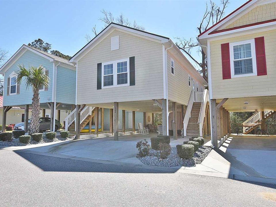 The popular Mako floor plan, this raised beach house is perfect for full time or vacation second home. 2 master suites and an open floor plan living dining and kitchen area with stainless steel appliances, granite counter tops, soft close cabinets and gas cooking. Window treatments convey, storm door and gutter guards upgrades with down stairs bar area. With under house entertaining you will love this home minutes from the beach but in a quiet community on the ICW with Marina dry storage and soon a new restaurant on the waterway opening late Spring/Summer 2019.