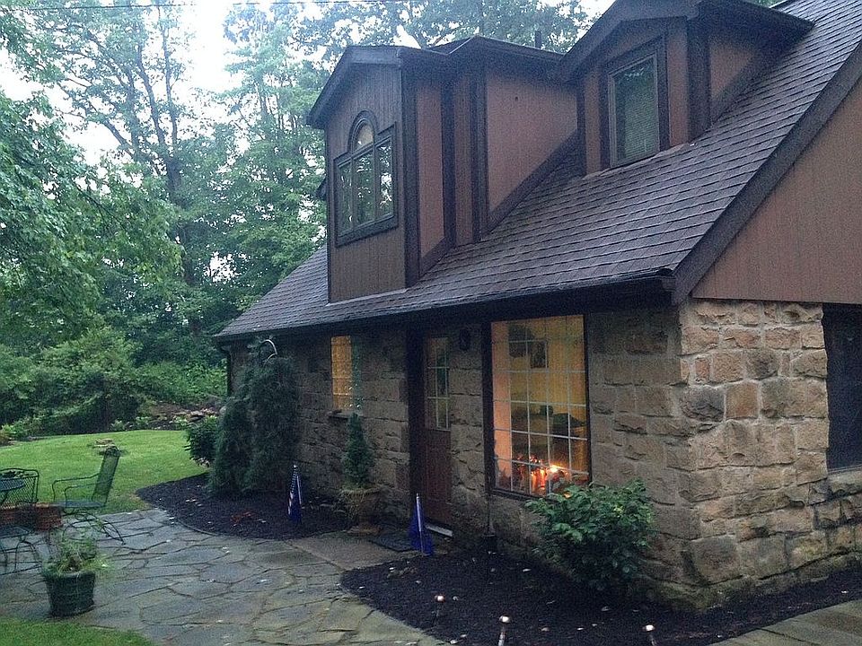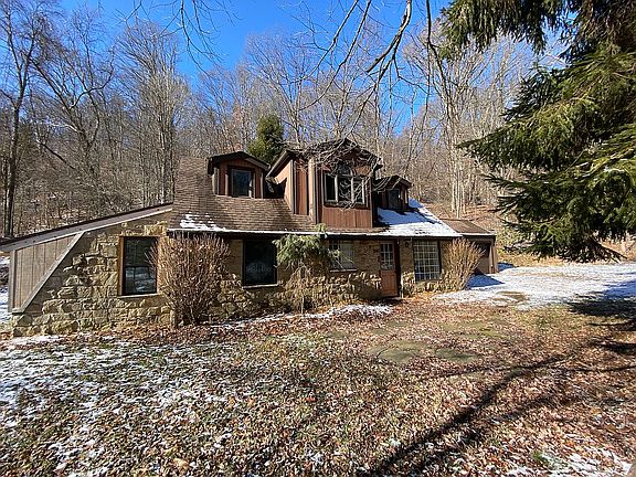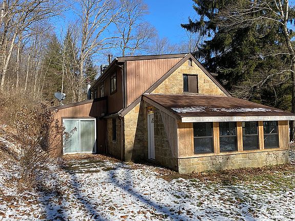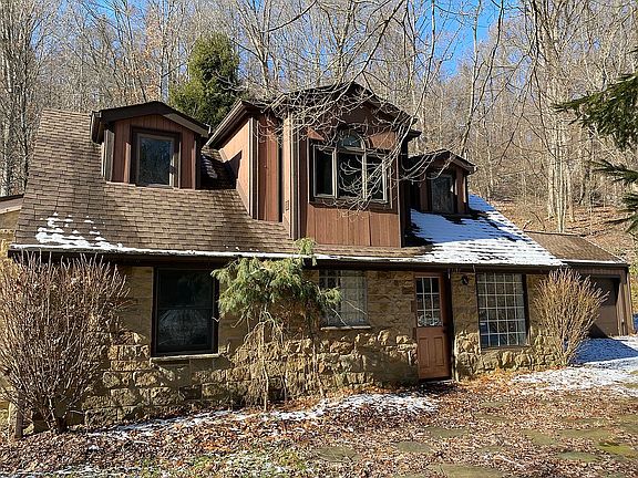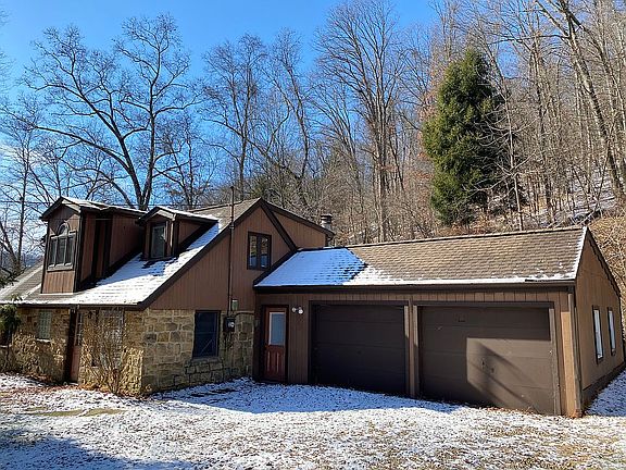 OFFER ACCEPTED Rustic ambience abounds in this stone cottage-like two story slab home! Put some finishing touches on this home to make it your own!!! Cross the driveway bridge over the babbling stream onto 3 acres of peaceful wooded property with level, useable front yard and charming landscaping. Upon entering, you will find a formal entryway, kitchen and family room with exposed wooden beams, high ceilings, cozy wood burning stove and separate sunroom. Each level of this home has 2 bedrooms and 1 full baths, one with Eljer jetted tub. Phenomenal home with plenty of space and privacy for a growing family! Stone & wood exterior, sunroom, exposed wood beams, large wooded lot in conservancy area with stream, main level laundry, bedrooms & full baths on each level, jetted bathtub, Andersen windows, water conditioning system Property Sold As-Is