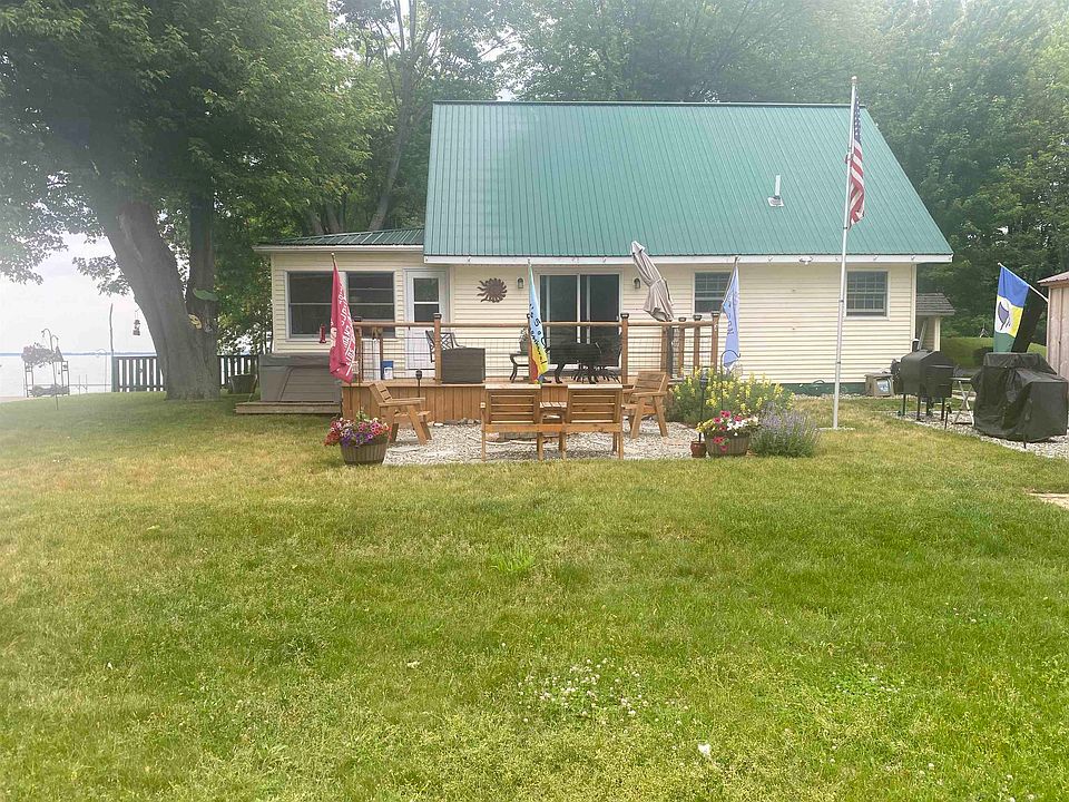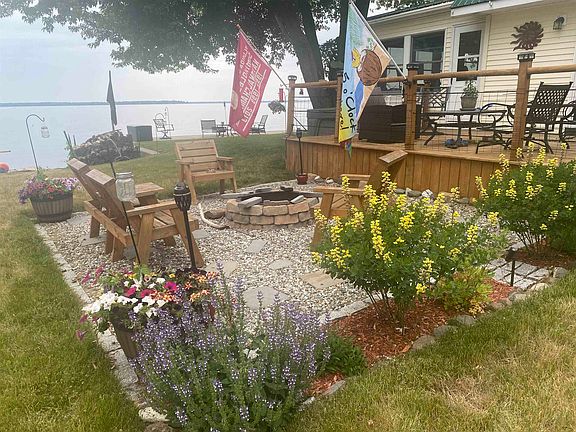 Beautiful lakefront property with lots to offer; the first floor offers a kitchen, dining room, living room, bedroom and full bath as well as a large 4 season sunroom. There are 2 separate spaces upstairs that could easily be made into 2 more rooms. The patio/seawall make for stunning westerly panoramic sunset views, 2 sheds (1 with electricity) convey. Mature landscaping, fire pit, stone sidewalk, large deck and ample storage, newer Culligan whole home water filtration system.