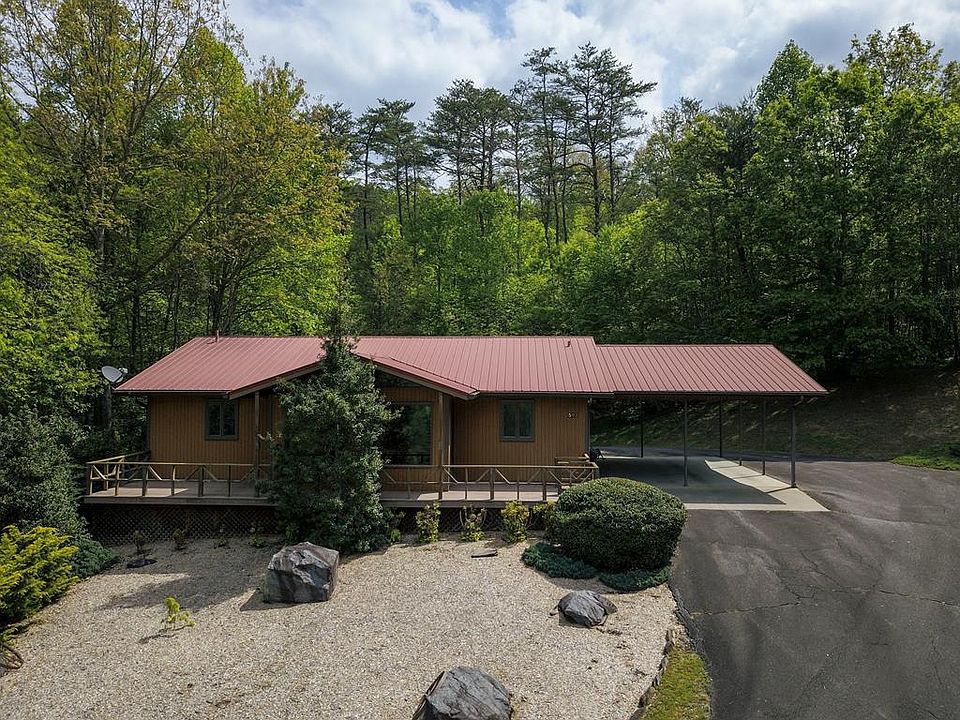 Well maintained 2 bedrooms 2 bath home with full basement overlooking a pastoral setting plus a long-range view! Easy year-round access with a paved circular driveway with attached 2 car carport and a one-car garage in basement. Nice landscaped yard and a full-length deck with long-lasting Trex decking. Inside features a split floor plan with bedrooms on the opposite side of the living area. Large living room with hardwood floors, vaulted ceiling, and large windows to enjoy the views and let in the sun. Large dining room off the galley-style kitchen. Spacious master bedroom with ensuite bath and walk-in closet. Main level washer and dryer hookup as well as in the basement. Home has central heat and air, metal roof, full basement with interior access, nice yard, pastoral and mountain views, native flora, and easy year-round motorcycle-friendly paved access in a quiet neighborhood! Centrally located between Bryson City and Sylva and just a few minutes drive to Harrah's Cherokee Casino and all the outdoor attractions in the heart of the Great Smoky Mtns!